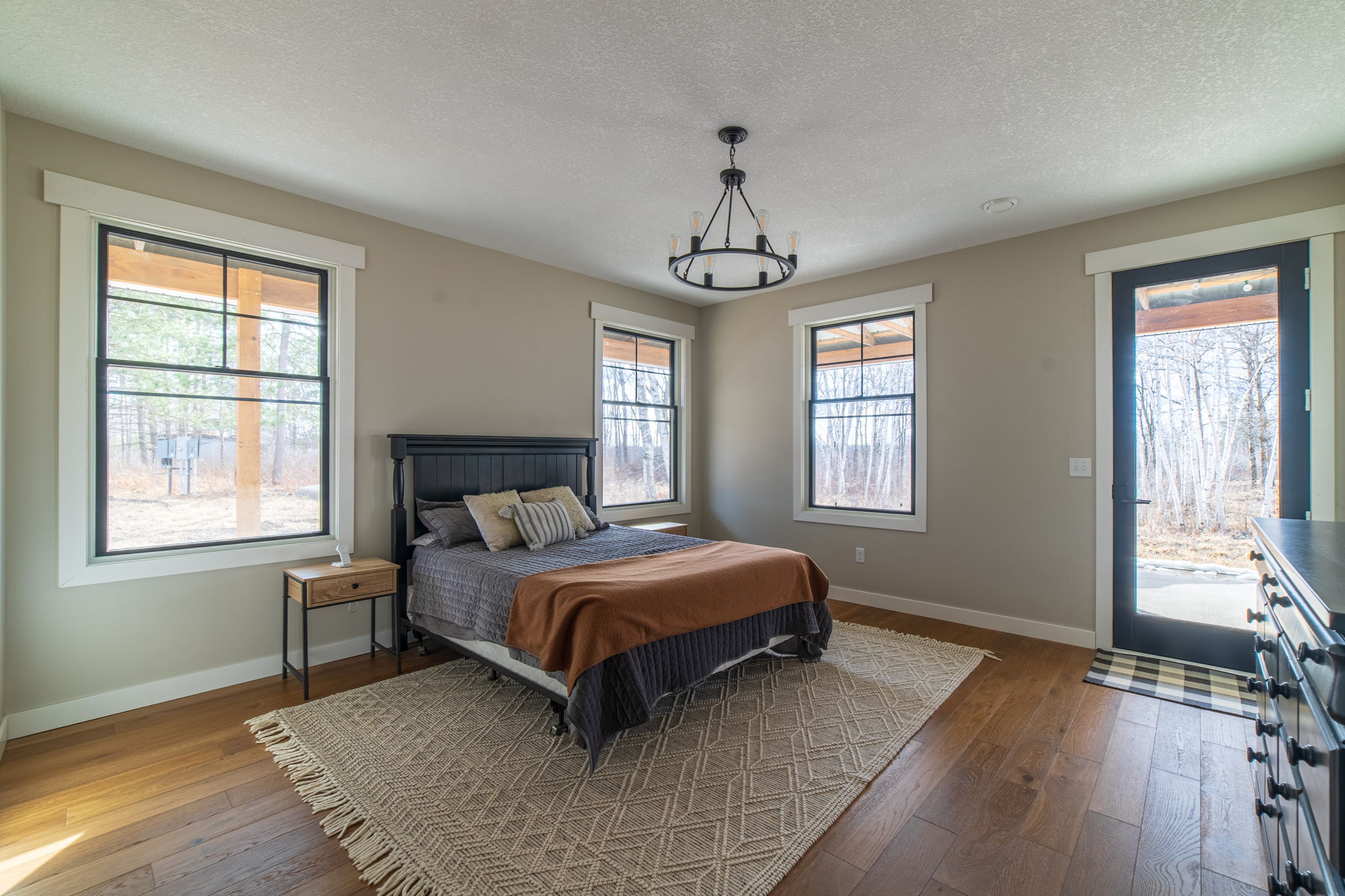 This beautifully maintained 5bd/ 3bath modern two-story house is nestled on 40 acres, offering privacy, wildlife, and scenic views. A long private driveway leads to the home’s striking white exterior with bold black trim and a wrap-around concrete walkway, enhancing its timeless appeal. Inside, a spacious entryway welcomes you into an open-concept design with 9-foot ceilings and an abundance of natural sunlight that fills the space. Large windows in the great room provide views of the pond and surrounding nature, creating a bright and inviting atmosphere. The kitchen is a chef’s dream, featuring a large island with a breakfast bar, a faucet at the range, and a walk-in pantry offering plenty of storage. Upstairs, you'll find a large movie room and a game room, perfect for family fun and entertainment. The main-level primary suite is thoughtfully designed, with the bedroom connecting to the en-suite bathroom, which leads to a spacious walk-in closet with direct access to the laundry room for added convenience. This home is filled with charm, from the generous office with built-in shelving to the large garage ideal for storing all your toys and vehicles, complemented by a cozy wood-burning stove that adds warmth and character throughout. This home combines thoughtful design, modern amenities, and beautiful natural surroundings, offering a rare opportunity to own a move-in-ready home in a serene, private setting.
